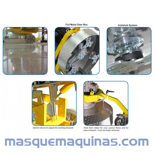 Pulidora planetaria con velocidad variable y presión de trabajo regulable.